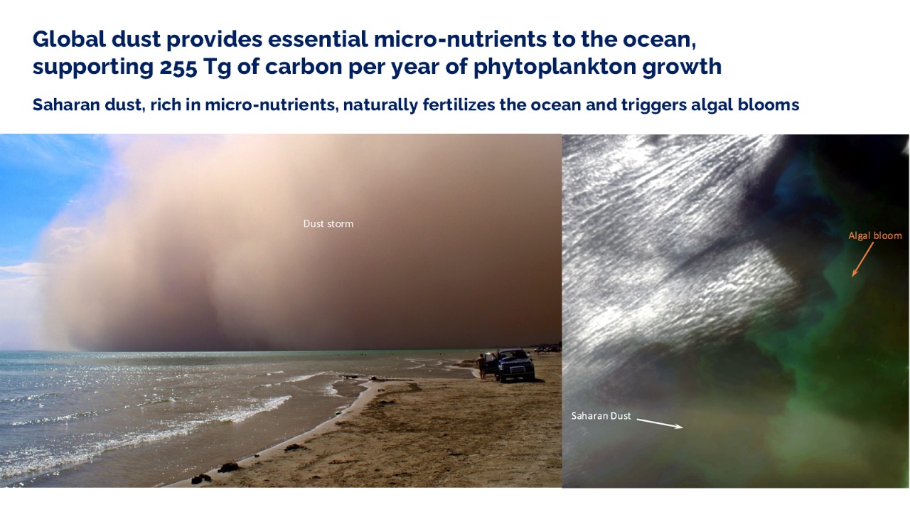 The open ocean doesn’t get many nutrients from land. Wind-blown dust delivers tiny amounts of iron and other micronutrients across long distances, helping plankton grow even in remote waters. Studies show this dust can support a meaningful share of plankton growth, and those blooms drive about 20–40% of the carbon that sinks from the surface into the deep ocean each year.